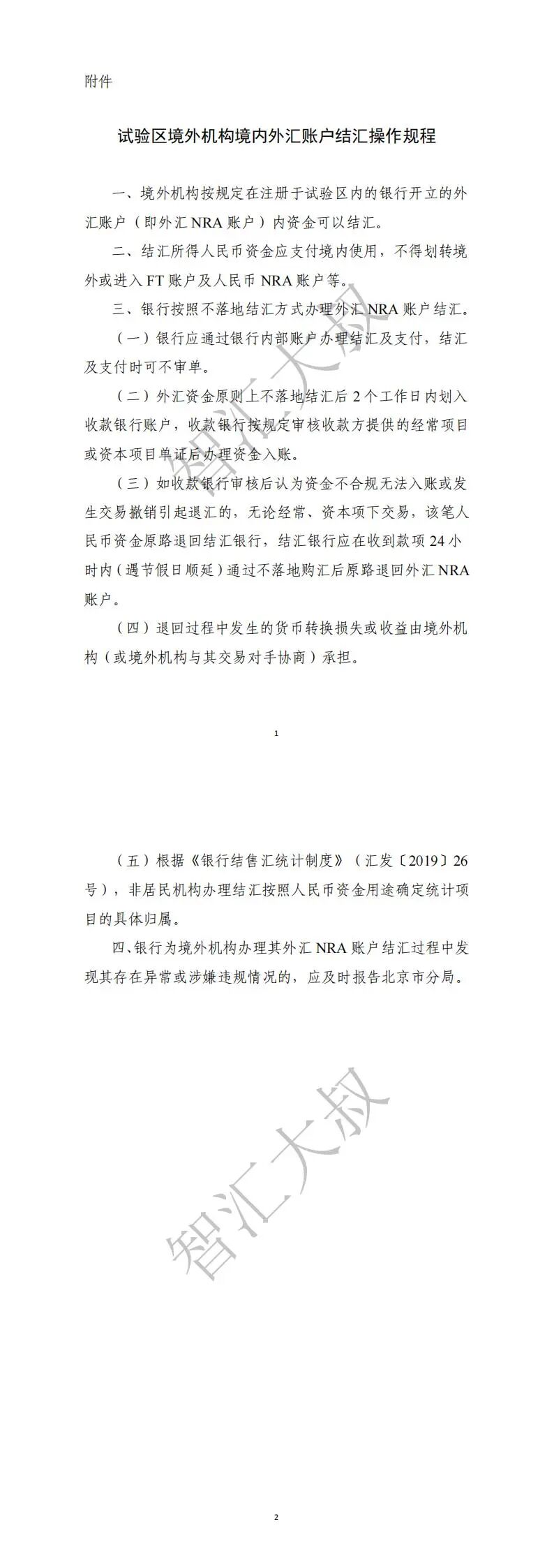 二、优化境外机构境内外汇账户(外汇NRA账户)退汇资金流程。对于外汇NRA账户向境内账户支付的资金,如因某些客观因素导致退回的情况,为避免汇兑损失,结汇银行可将资金暂存内部账户,24小时内(遇节假日顺延)仍未解决的再购汇原路退回(操作规程见附件)。